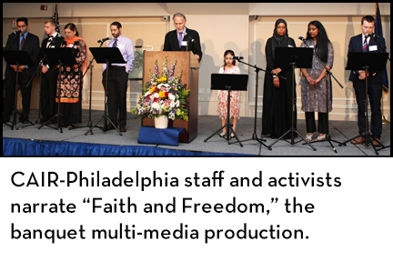 Nearly 700 CAIR-Philadelphia supporters and invited guests filled the Springfield Country Club ballroom on March 15 for our chapter’s 8th Annual Banquet. It was a joyous affair for all who attended. The evening program began with a welcome by our wonderful MC Maryam Elarbi, followed by a beautiful Qur’an recitation by Sohaib Mannan. One of the highlights of the banquet was a multi-media program, narrated by a group of 9 CAIR staff and activists, on the banquet theme of “Faith and Freedom.” Internationally known Muslim scholar and community leader Imam Zaid Shakir of Zaytuna College then stirred the hall with his inspired call for social justice. As a finale, comedian Azhar Usman left us laughing uncontrollably with his hilarious routine satirizing everything from Muslim family life to the idiocy of Islamophobia.